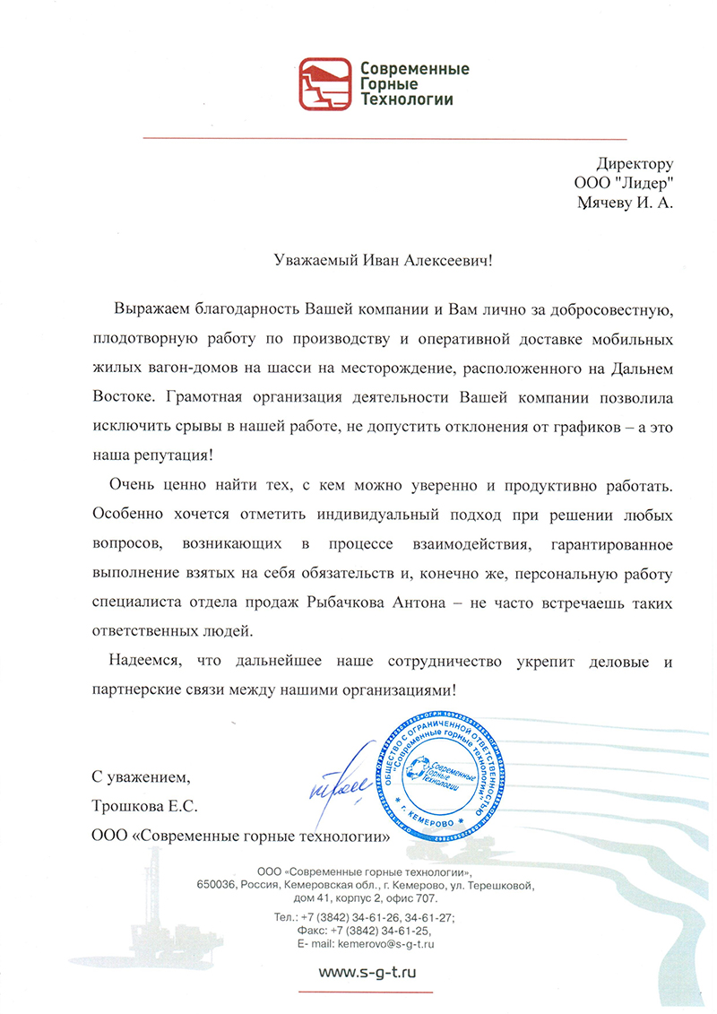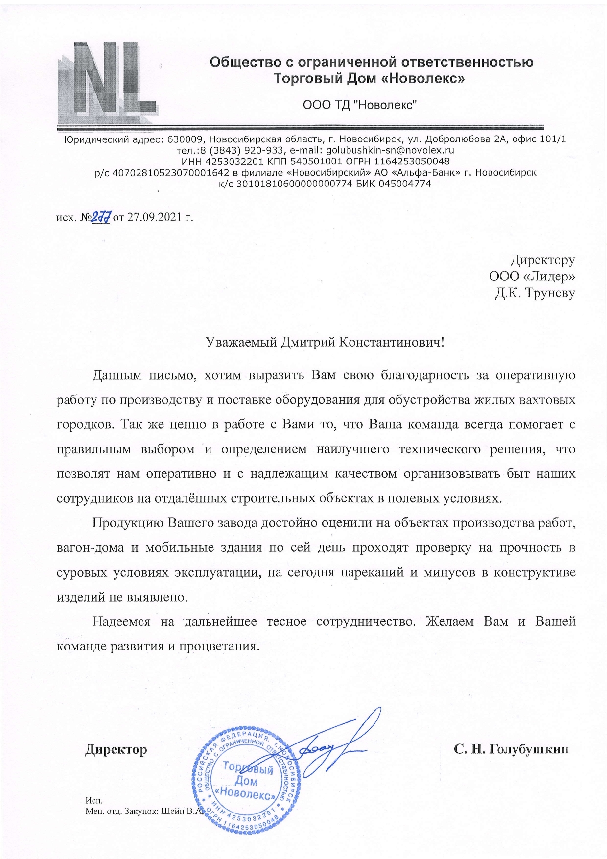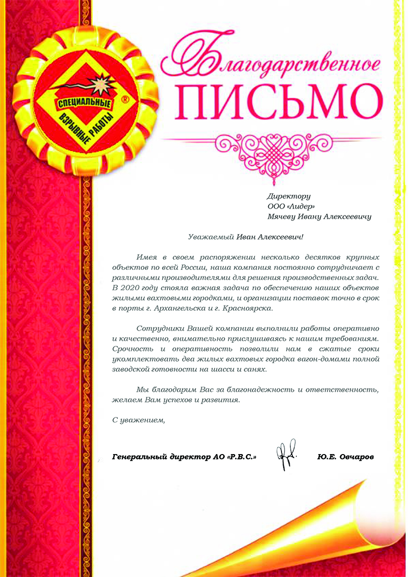 Компания «Лидер» за время работы разработала свыше 8 тысяч схем компоновки и комплектации вагон-домов и инвентарных модулей. Эта продукция используется для проживания персонала в местах проведения лесозаготовительных, строительных, геологоразведочных, буровых работ.